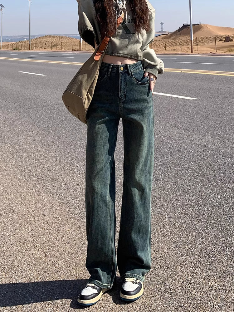 American retro blue straight-leg wide-leg jeans for women, casual and versatile, light-colored, floor-length trousers.