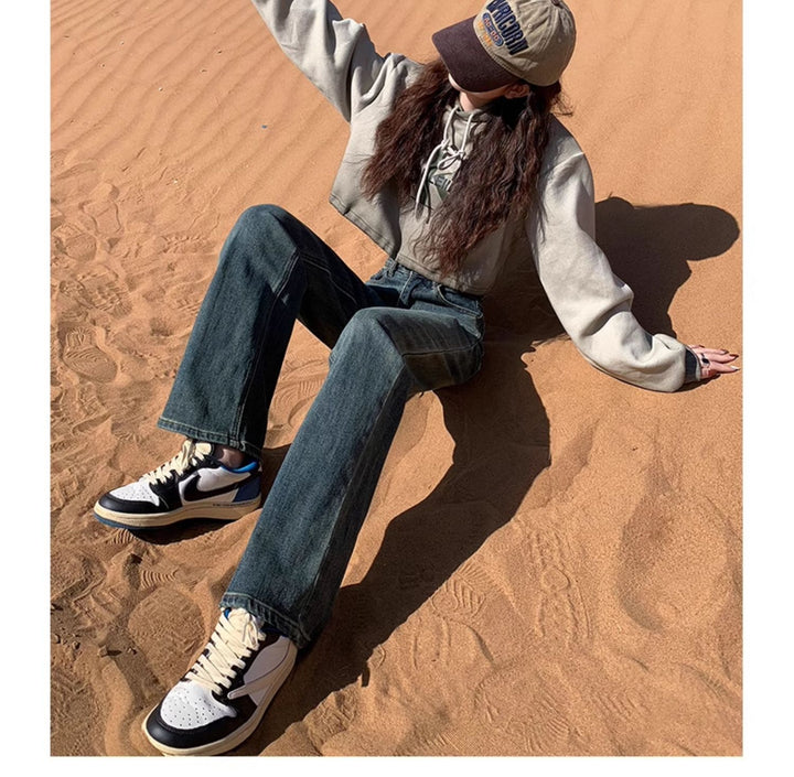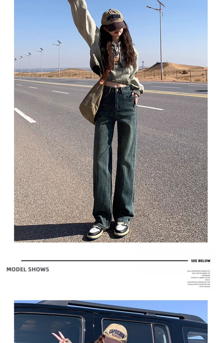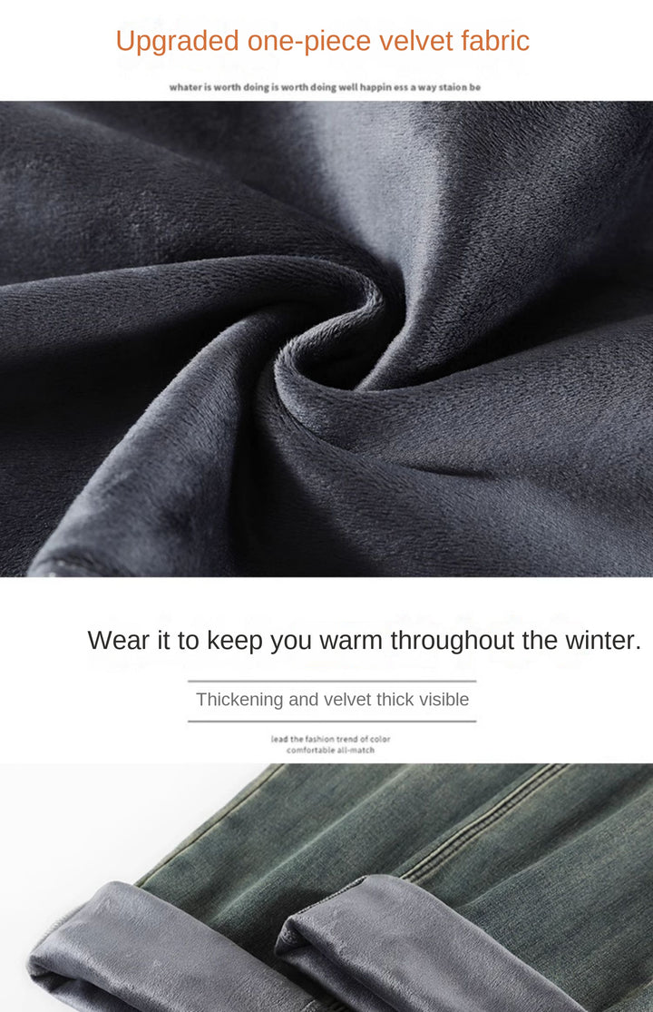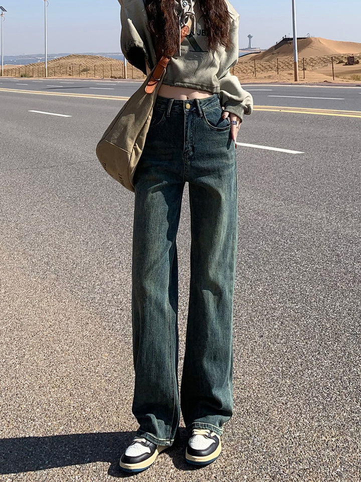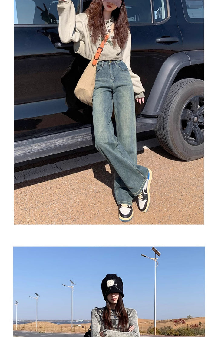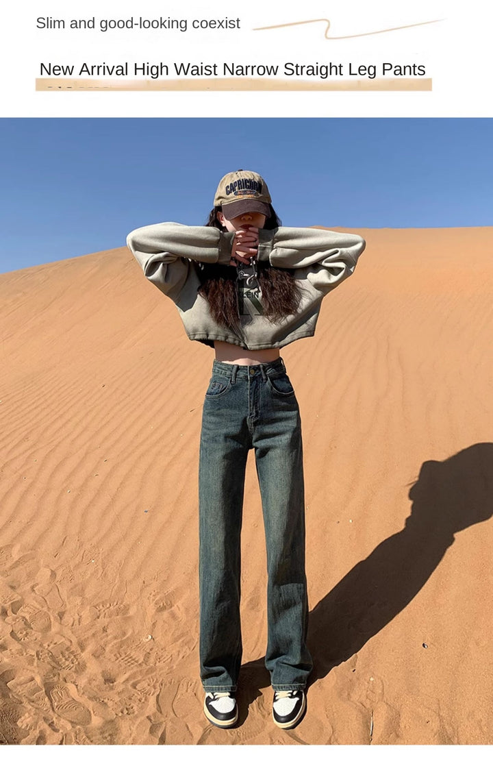 Cement gray fleece-lined slim-fit straight leg jeans for women, new style, high-waisted, slimming, wide-leg pants for petite women.
