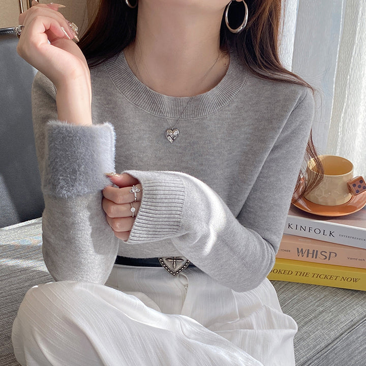 New autumn/winter style fleece-lined, thickened round neck sweater for women, solid color, soft and cozy knitted base layer top.