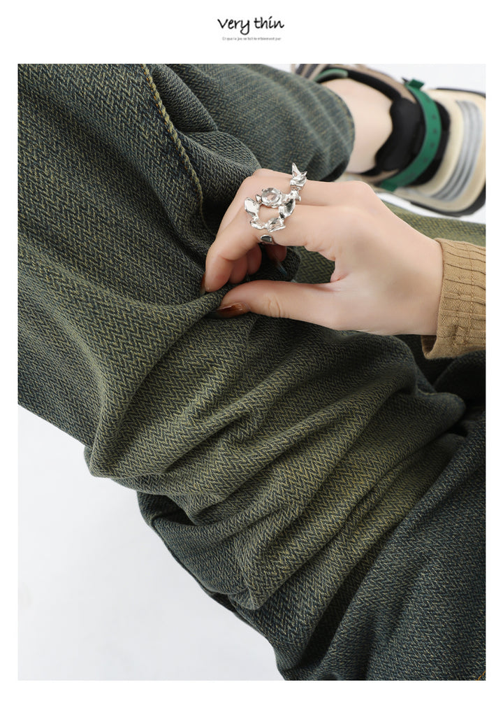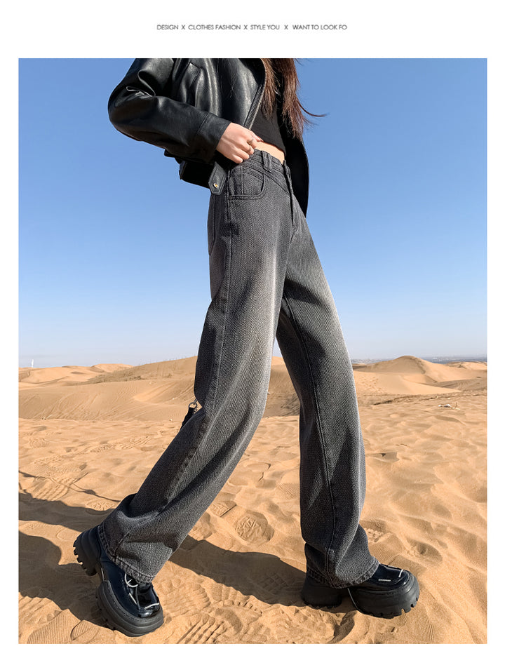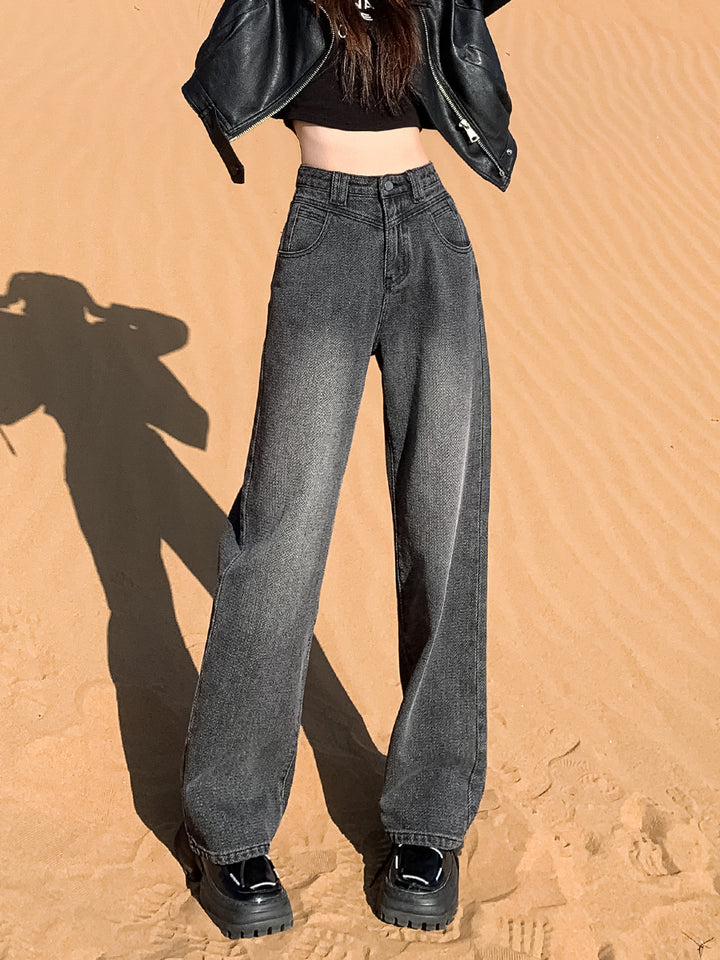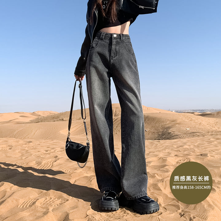 New style black and gray wide-leg jeans for women, American style, high-waisted, loose fit, slimming, straight leg, autumn and winter look.