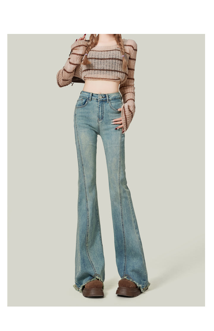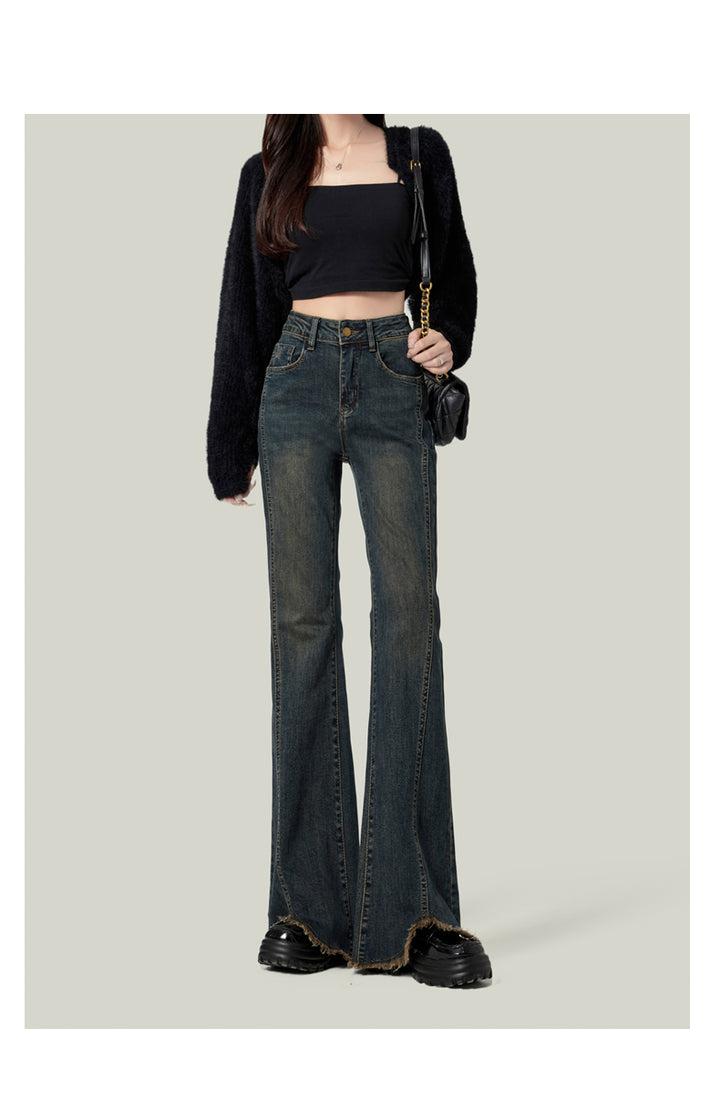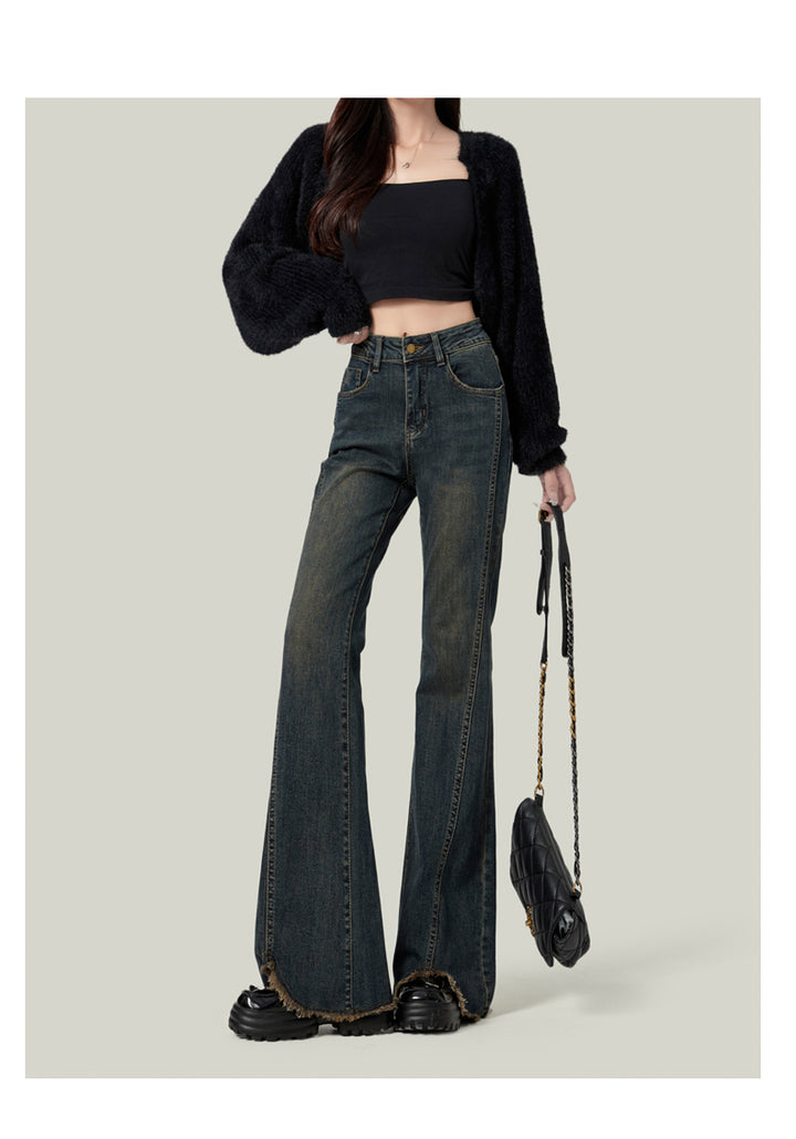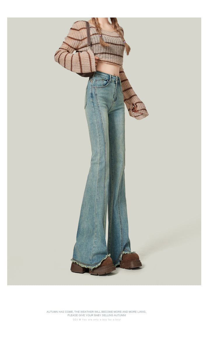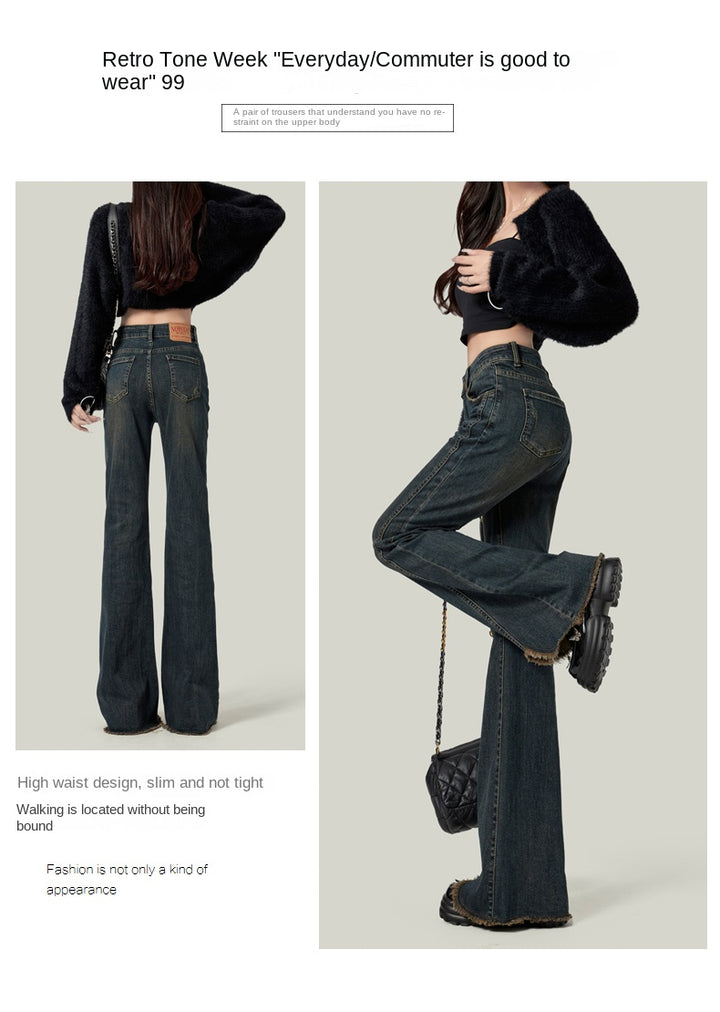 Retro American style high-waisted nano gray flared jeans for women, slimming, platform, floor-length trousers