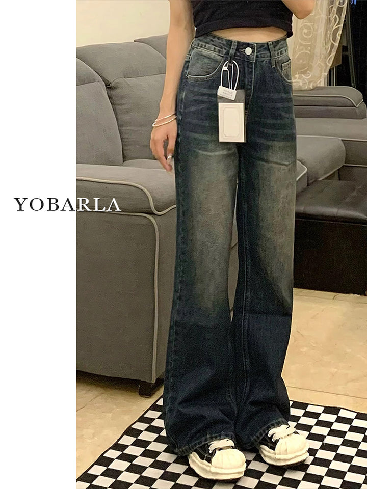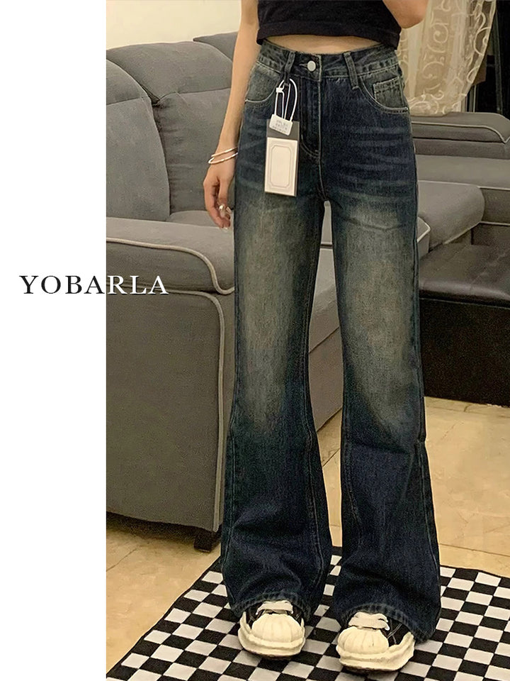 Retro blue flared jeans for women, autumn and winter, fleece-lined and thickened, plus size, loose fit, slimming, pear-shaped figure, long pants.