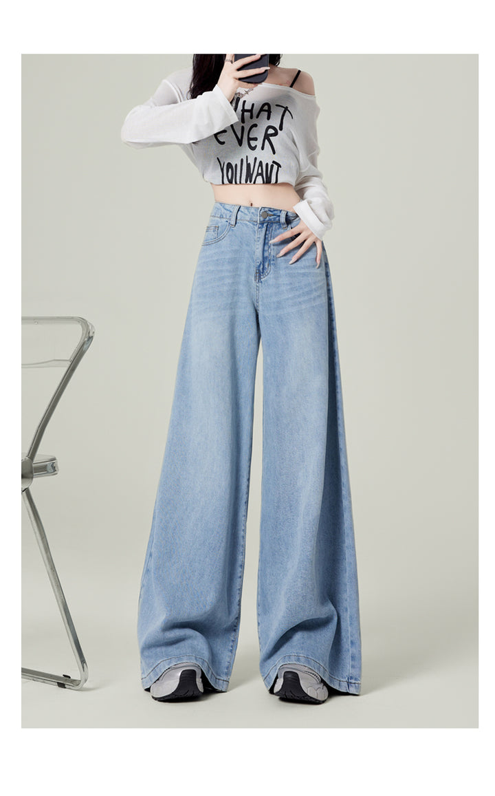 New season's retro dark blue wide-leg jeans for women, perfect for spring and autumn, high-waisted, loose-fitting, floor-length.