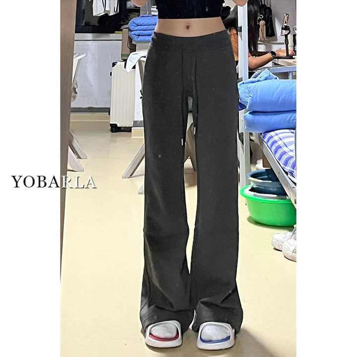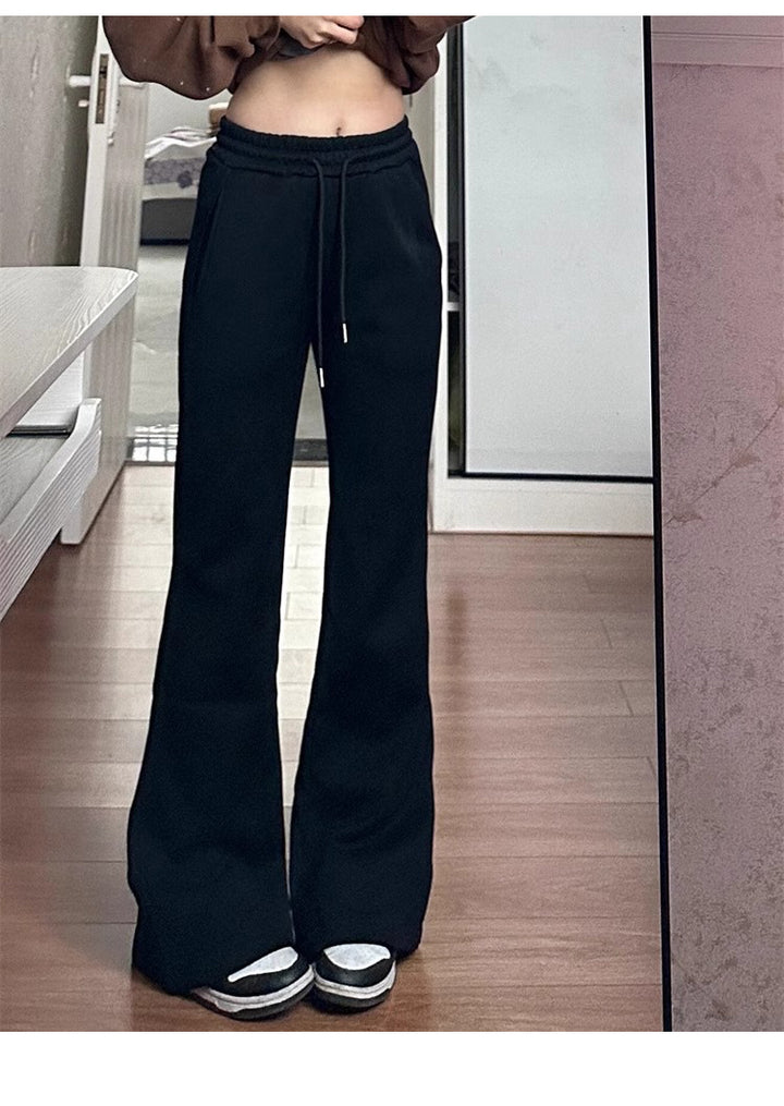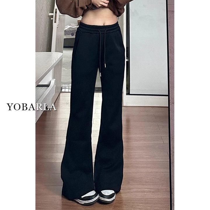 Women's black flared casual pants, autumn and winter style, fleece-lined, thickened, stretchy, plus size, flattering for pear-shaped figures, sporty sweatpants.