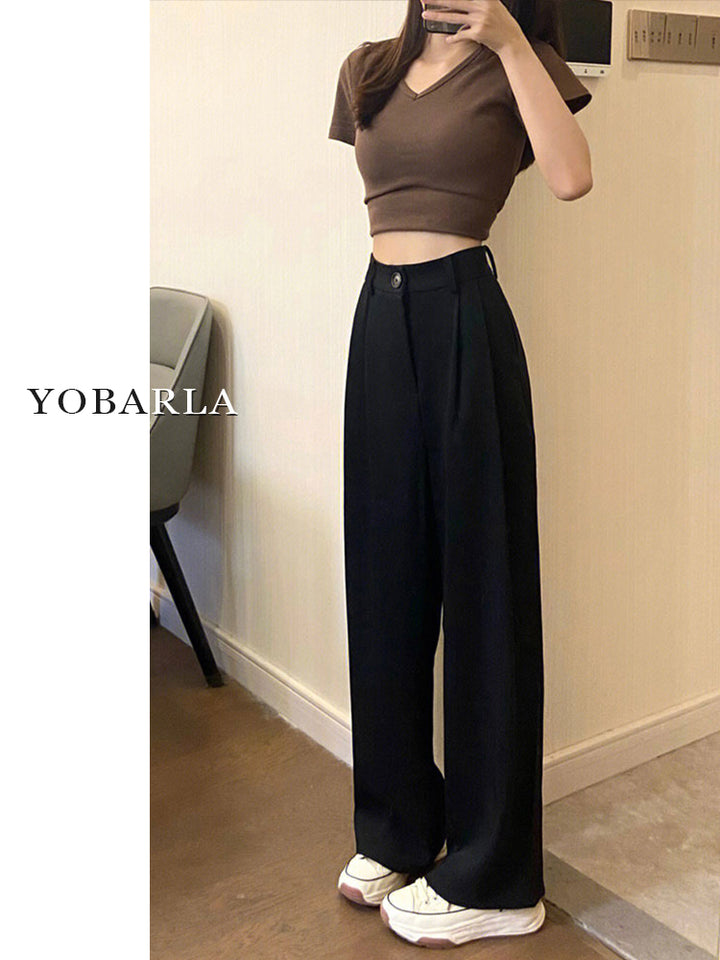 Women's black wide-leg casual suit pants, plus size, loose fit, flattering for pear-shaped figures, straight leg drape.