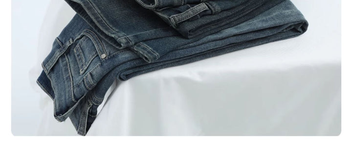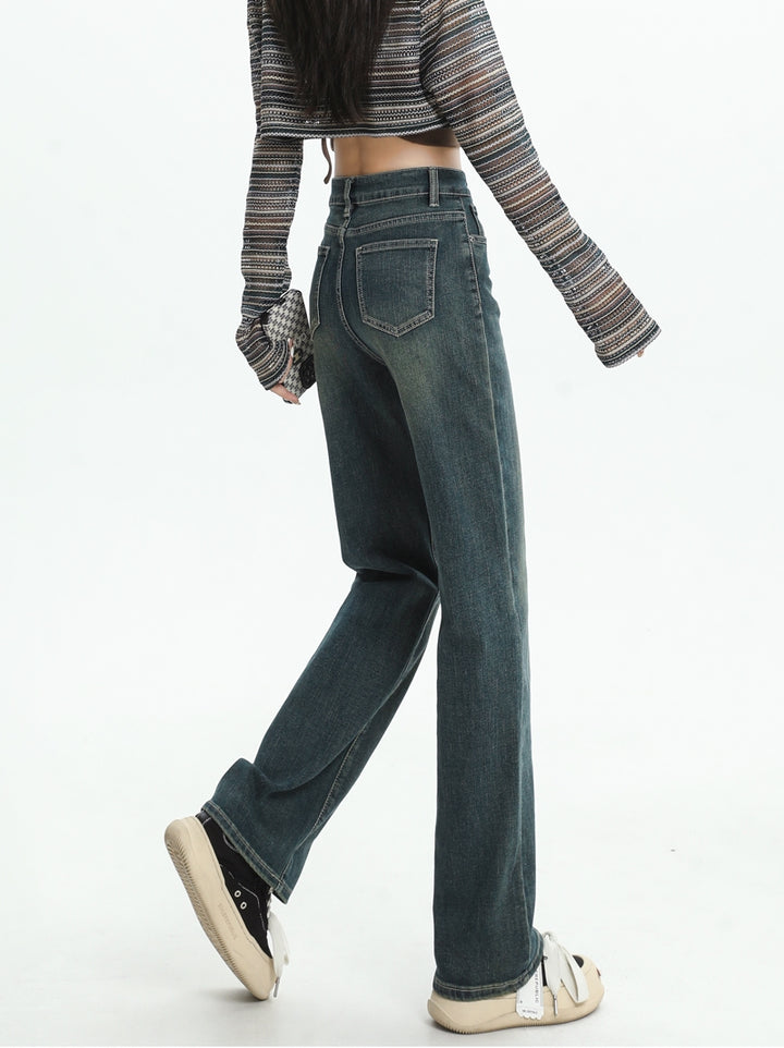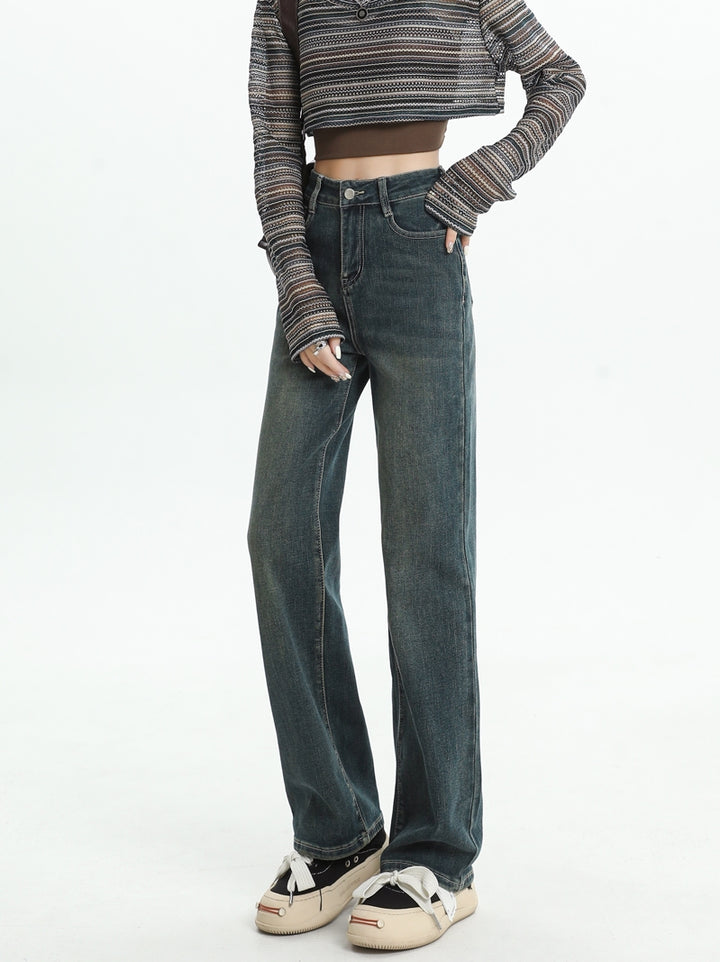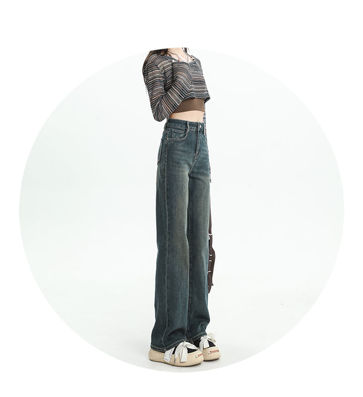 Women's straight-leg fleece-lined jeans, new autumn/winter style, high-waisted, retro, petite, slim-fit, wide-leg pants.